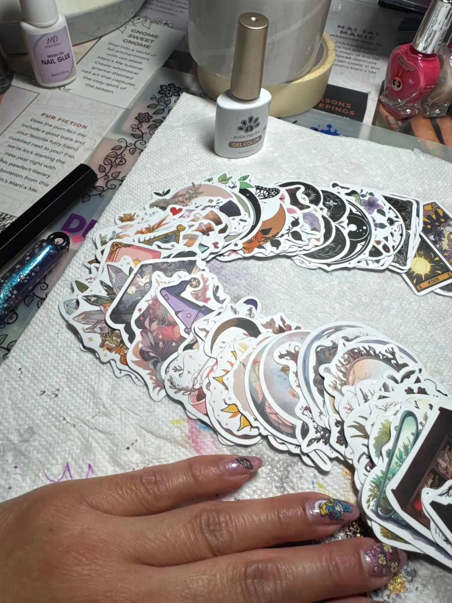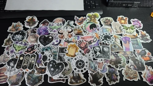 100 witchy stickers, there's good variety but they are more on a spooky, sinister side than for example other bundles with girlier stickers. These could be great for halloween. There are also about 10 black and white ones. They were squeezed in a tiny bag which slightly bended edges but overall it's ok. I would say i liked them for one time buy, but wouldn't repurchase)))